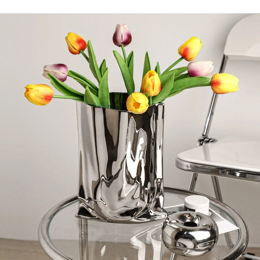 Vaso de Cerâmica Prateado | Design Plissado Moderno
